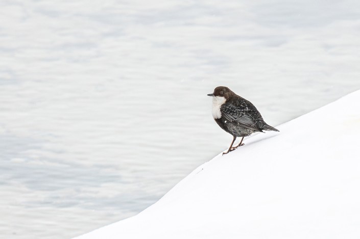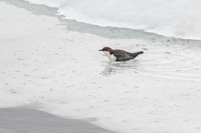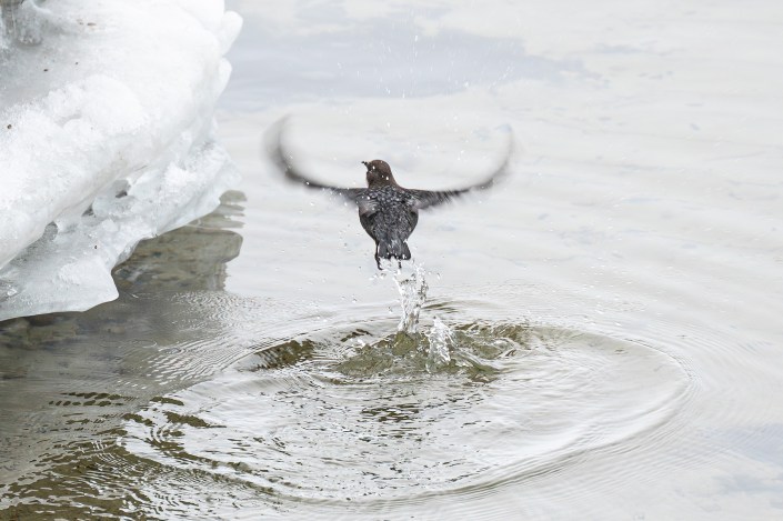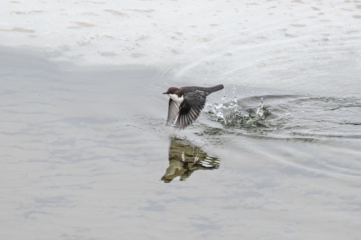 Fossekallen; som er Norges nasjonalfugl, er en hardfør liten krabat. Jeg er imponert hvordan den greier seg under de tøffeste naturforhold. Fossekallen er spesialist i å dykke og kan være opptil 30–60 sekunder under vann. Av og til svømmer den i overvannsstilling selv om føttene ikke har svømmehud. Under vann svømmer den med vingene. Den er knyttet til rennende vann, stryk og fosser, men den jeg har bilder av her har funnet seg en fin plass ved ei stille, isfri råk i Femund. Spesielt artig er å prøve å få fluktbilder av denne kjappe krabaten.